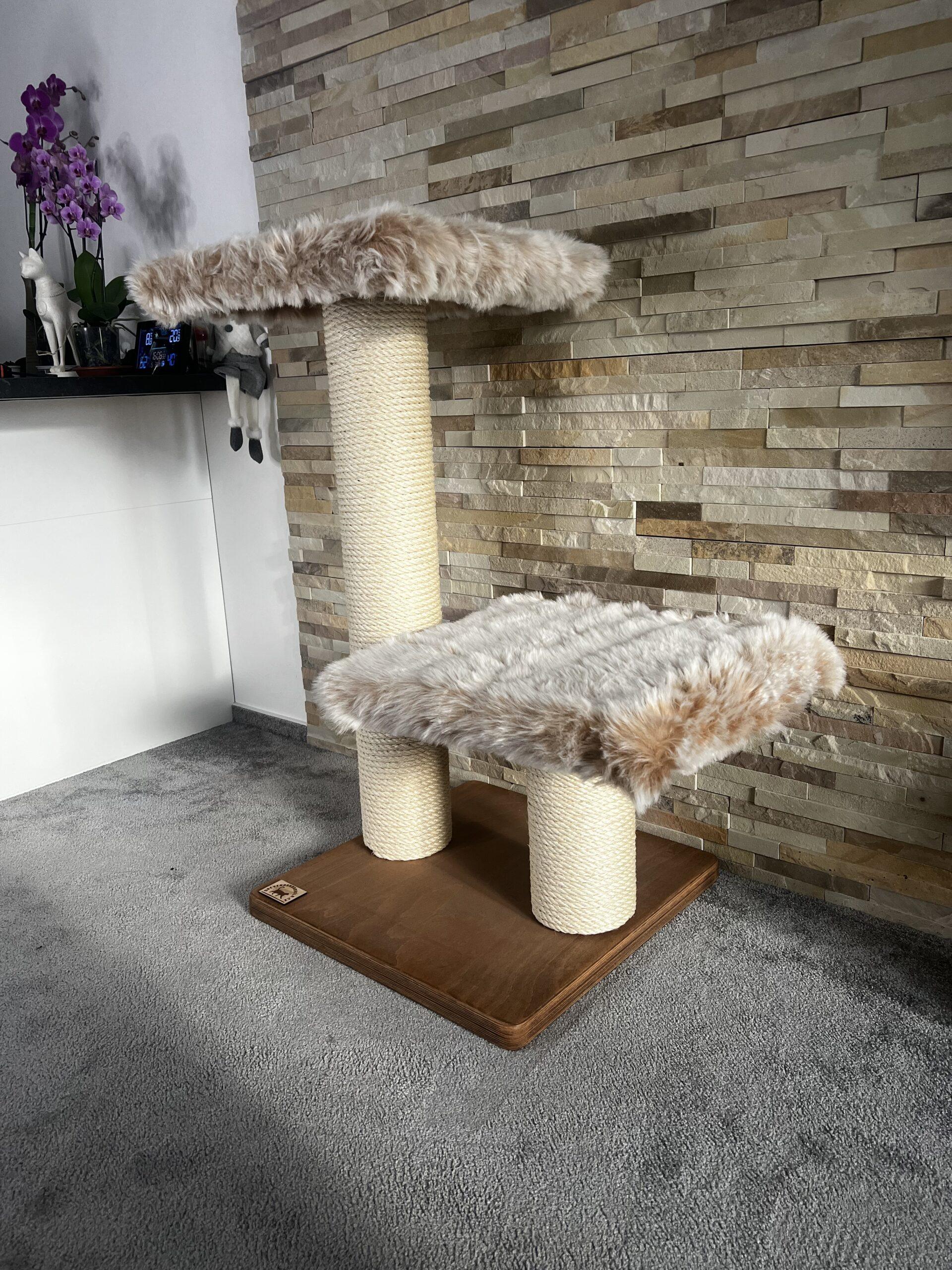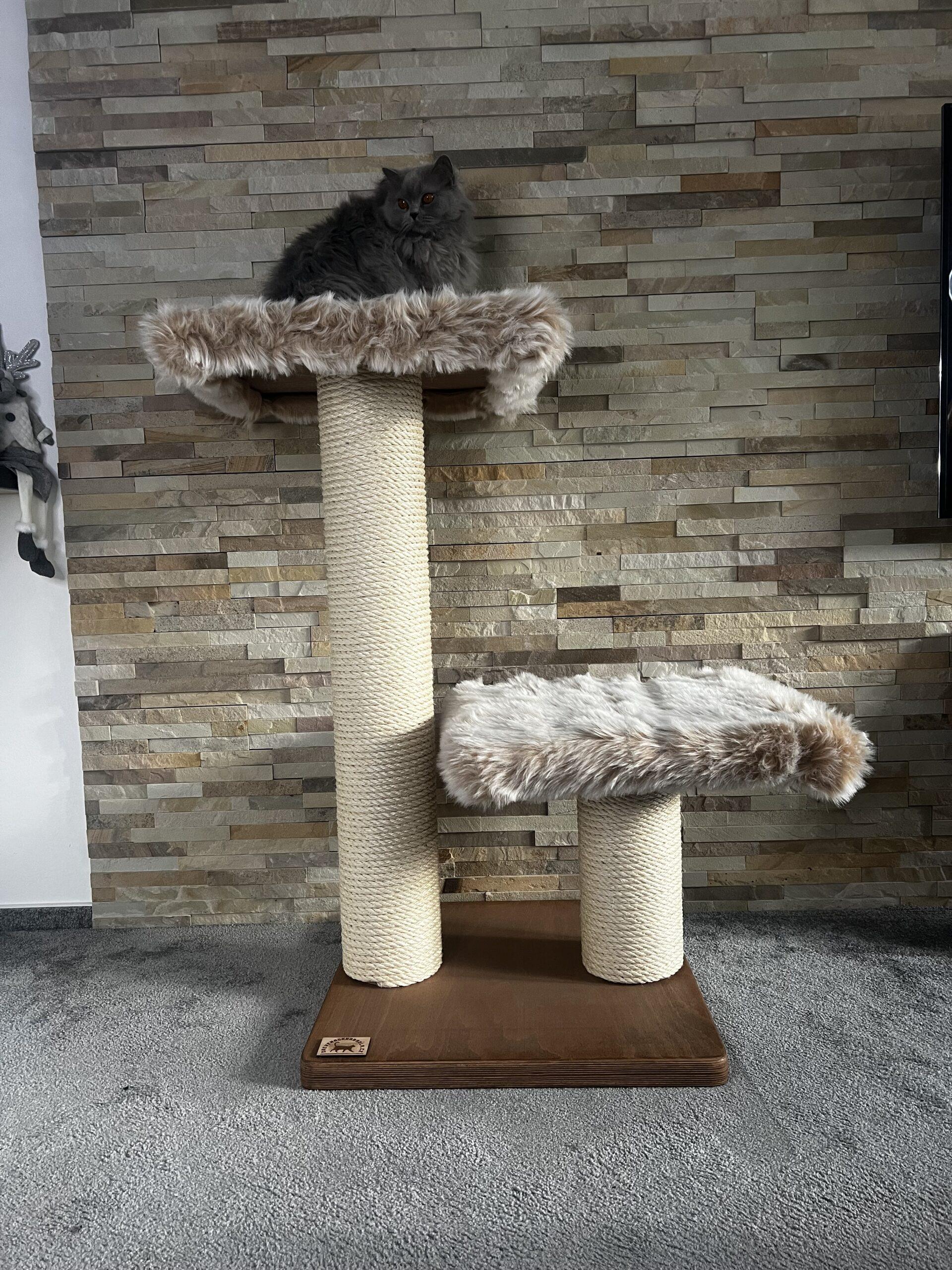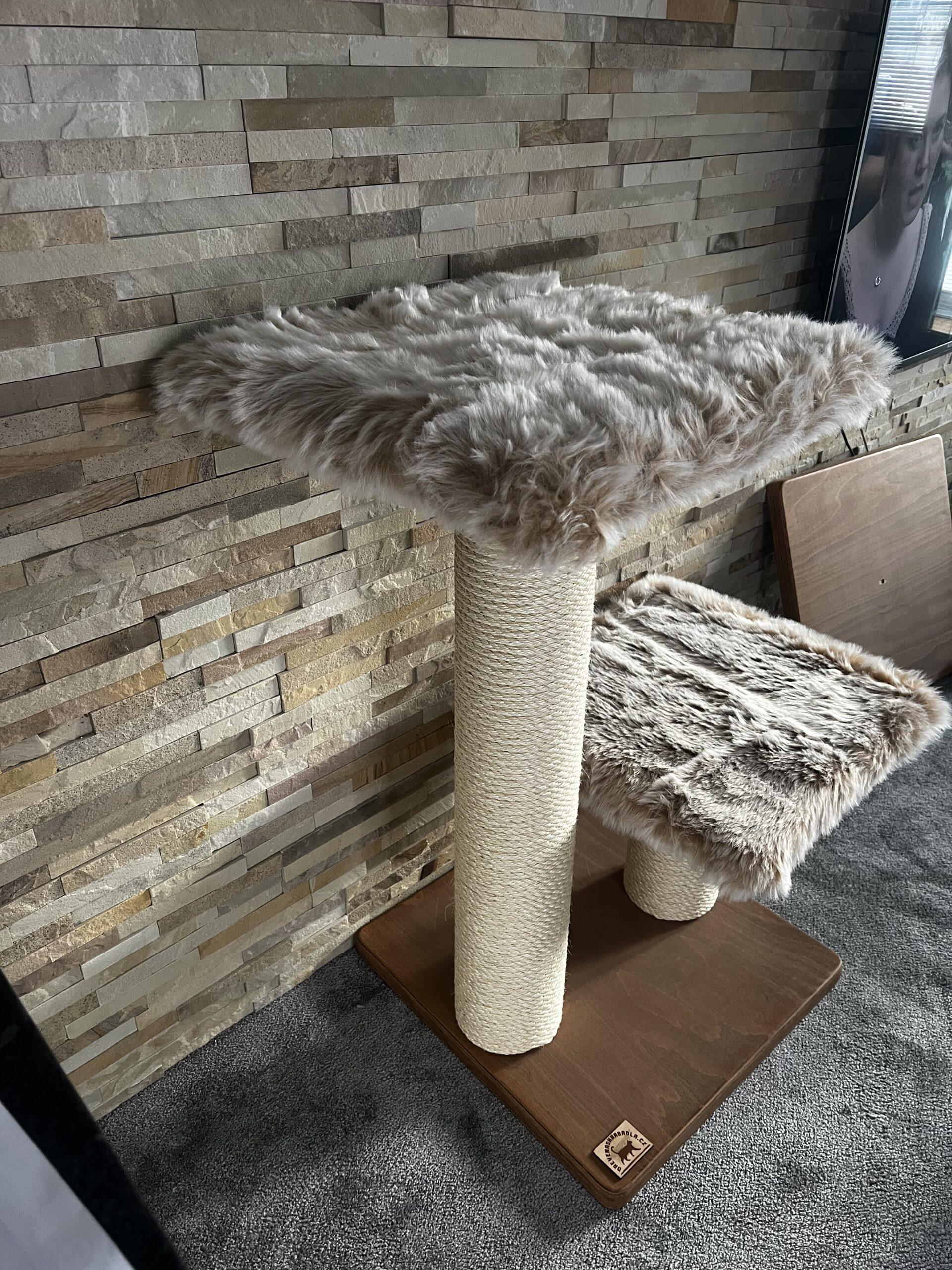 Folding cat scratching posts in combination with luxurious removable fur and strong sisal rope. Strong paper cylinders in combination with wooden boards create very sturdy scratching posts that do not need to be anchored to the wall at all and are free-standing.