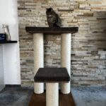 cat scratching posts in combination with a luxurious removable bed made of Corduroy and a strong sisal rope. Strong paper cylinders in combination with wooden boards create very sturdy scratching posts that do not need to be anchored to the wall and are free-standing.