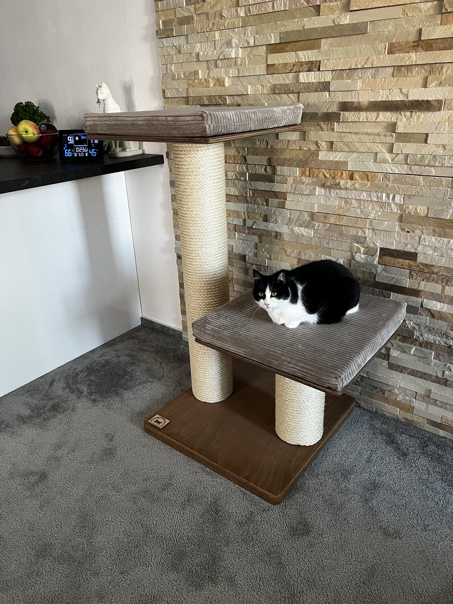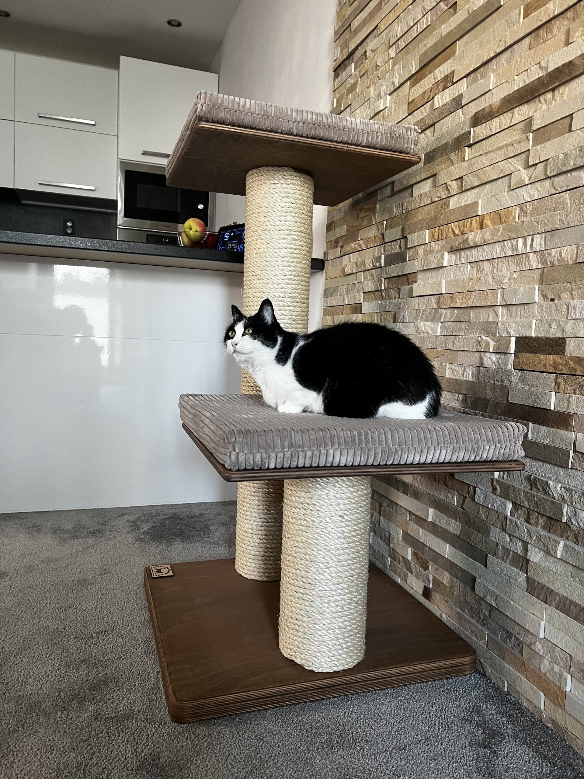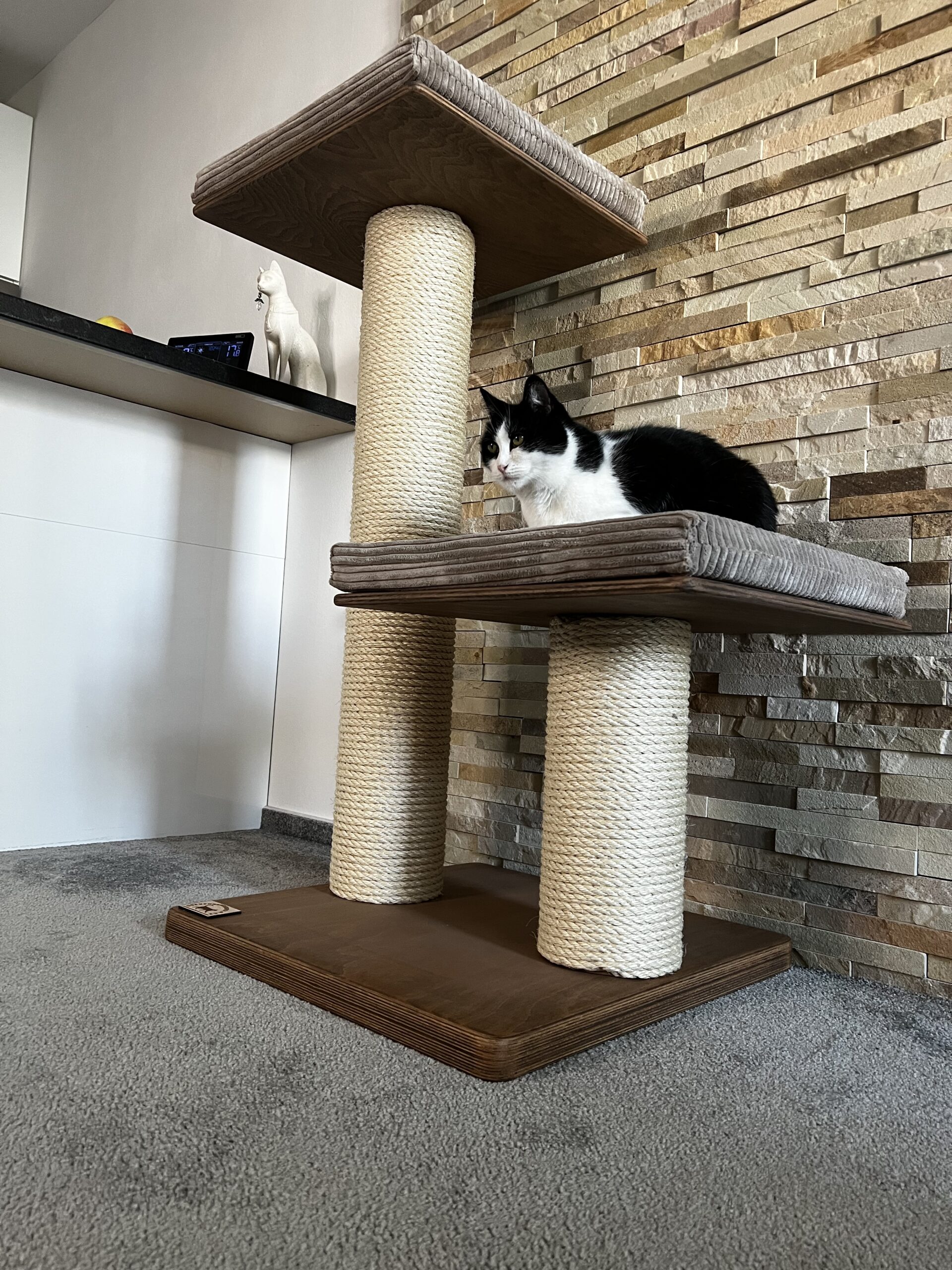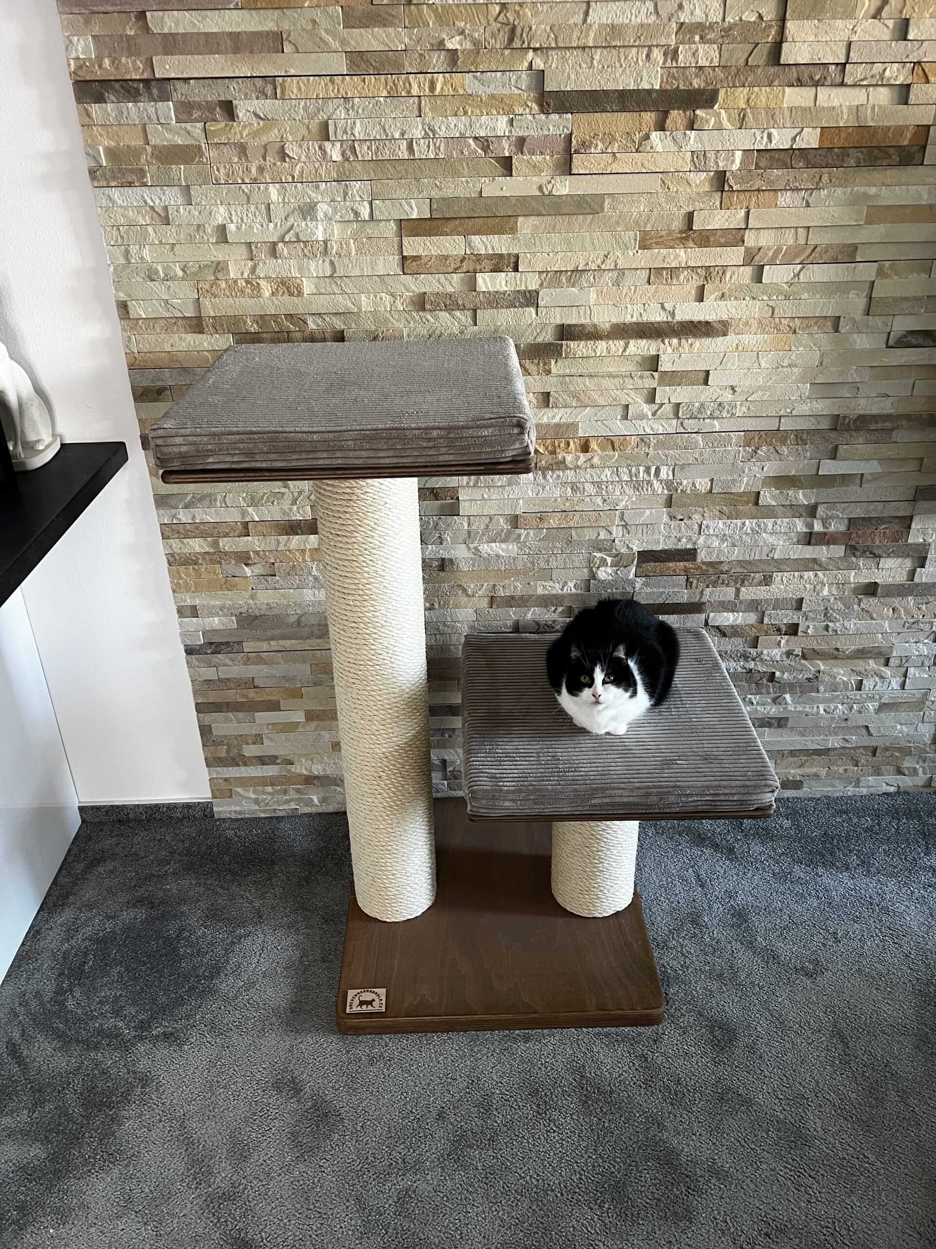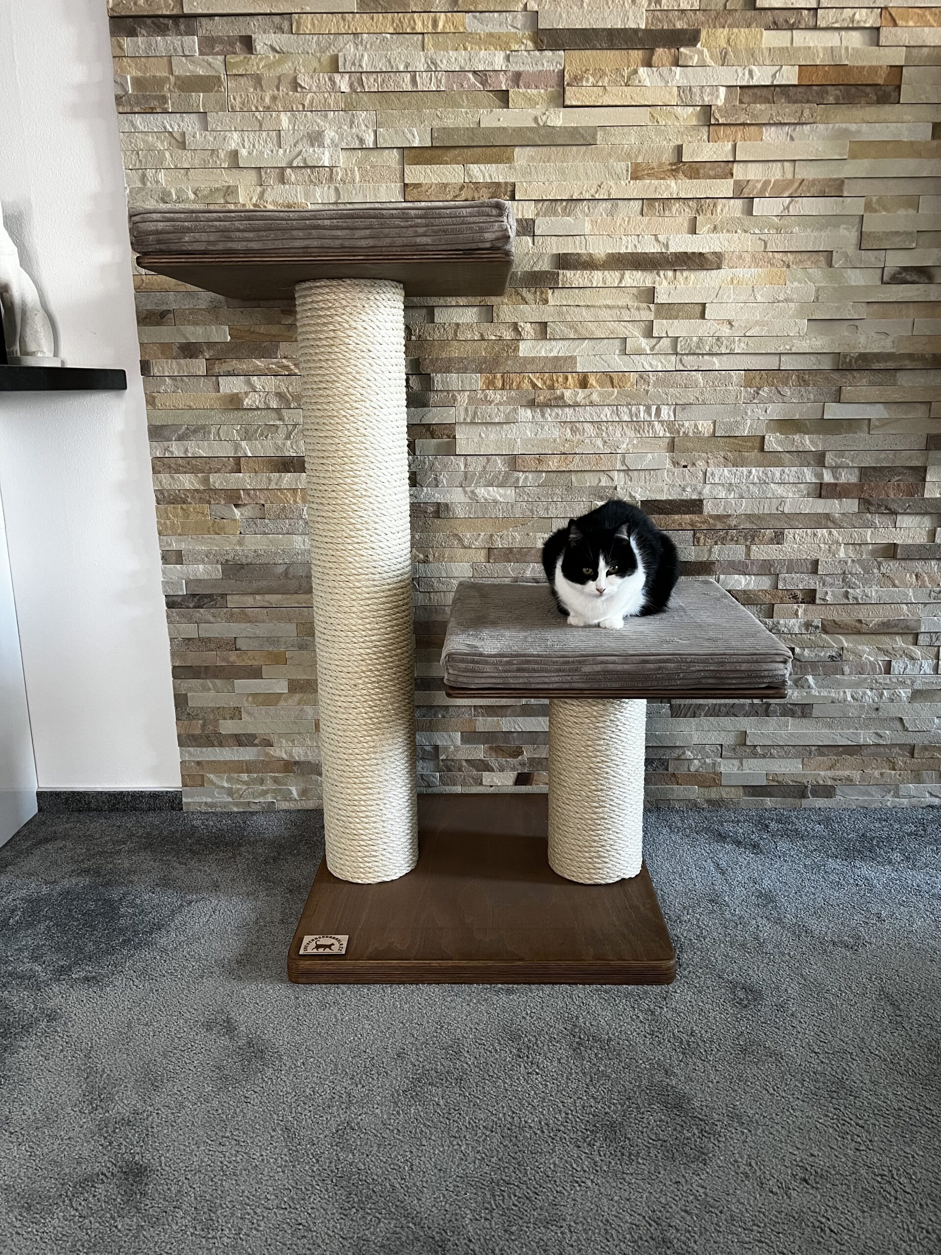 cat scratching posts in combination with a luxurious removable bed made of Corduroy and a strong sisal rope. Strong paper cylinders in combination with wooden boards create very sturdy scratching posts that do not need to be anchored to the wall and are free-standing.
