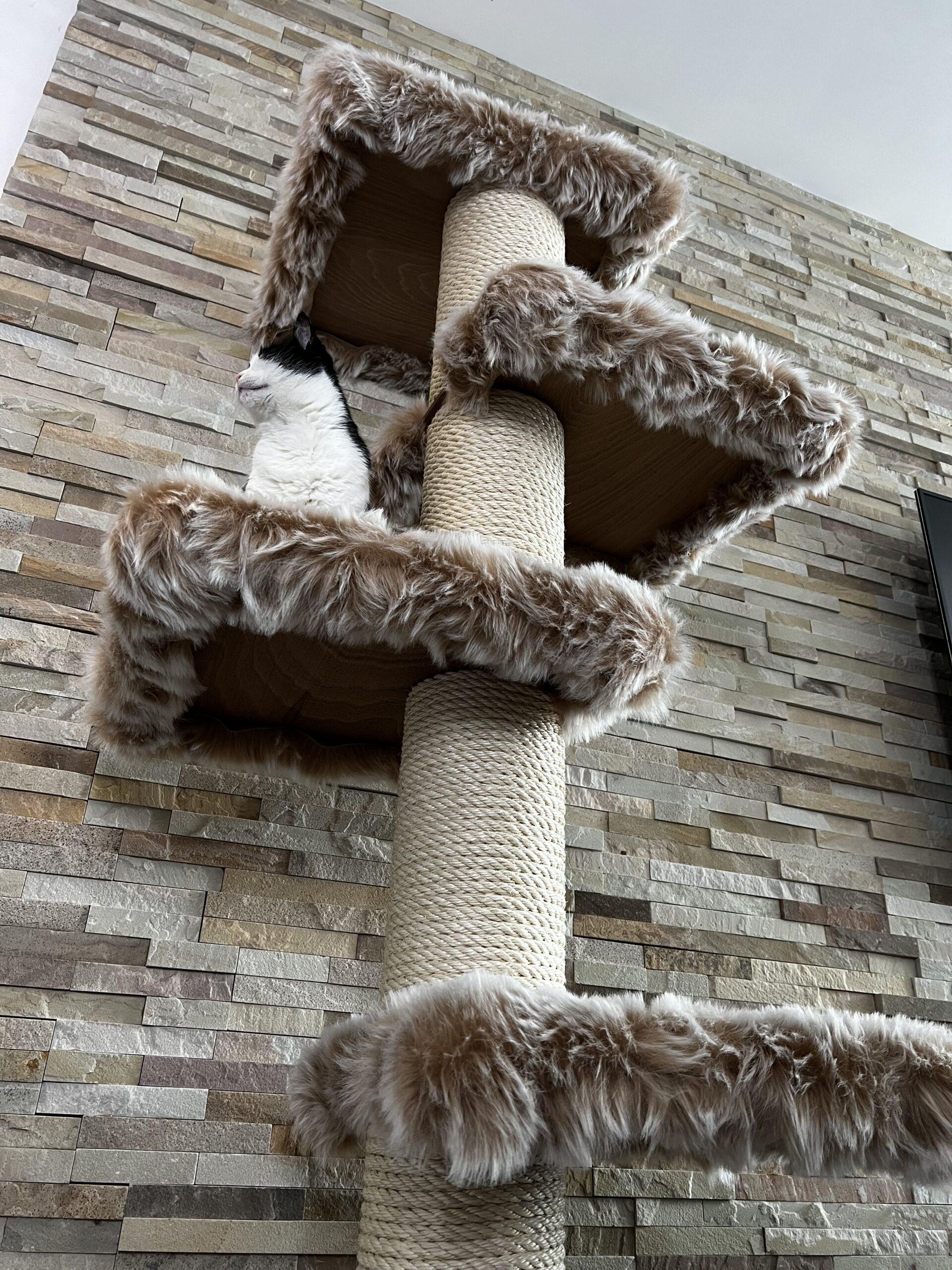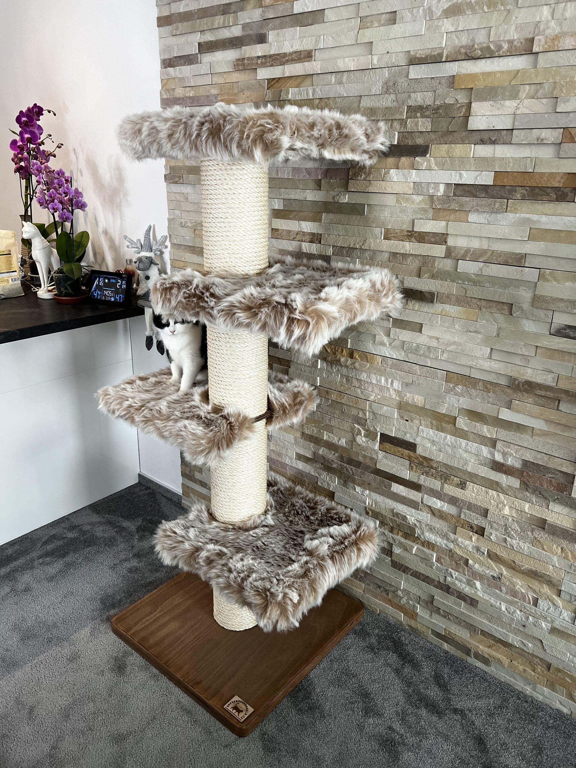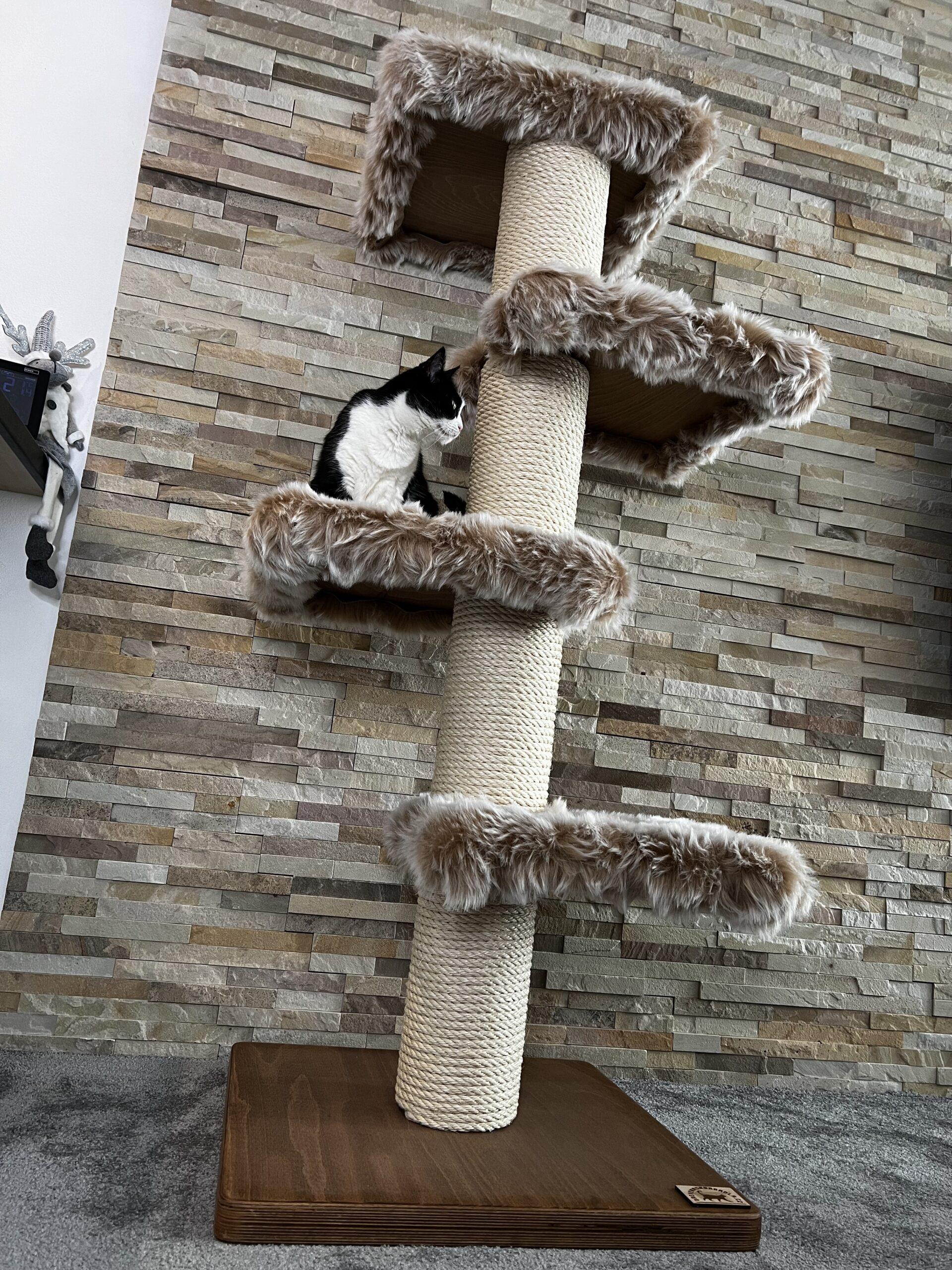 Cat tree / Cat scratcher in combination with luxurious removable fur and strong sisal rope. Strong paper cylinders in combination with wooden boards create very sturdy scratching posts that do not need to be anchored to the wall at all and are free-standing.