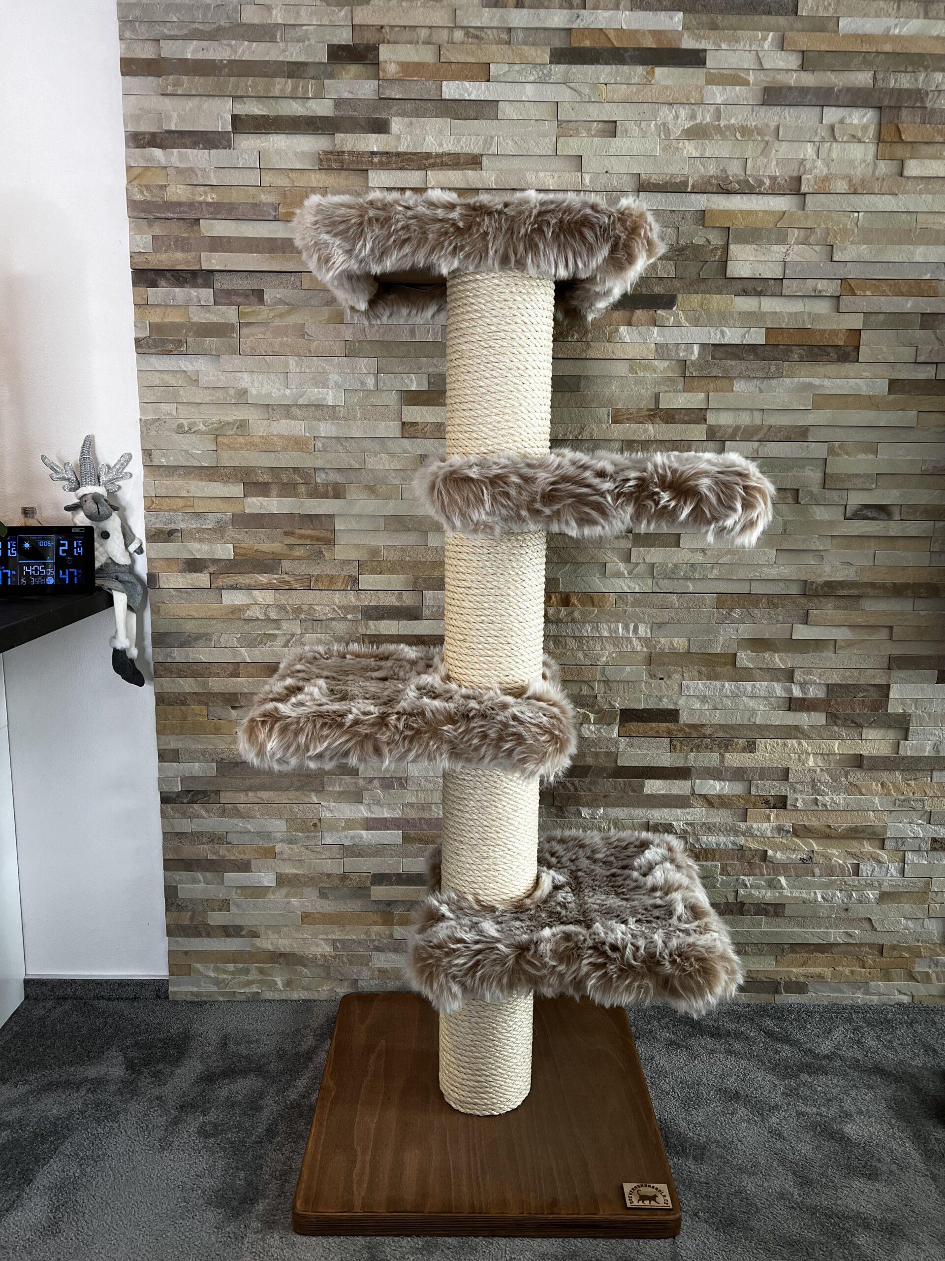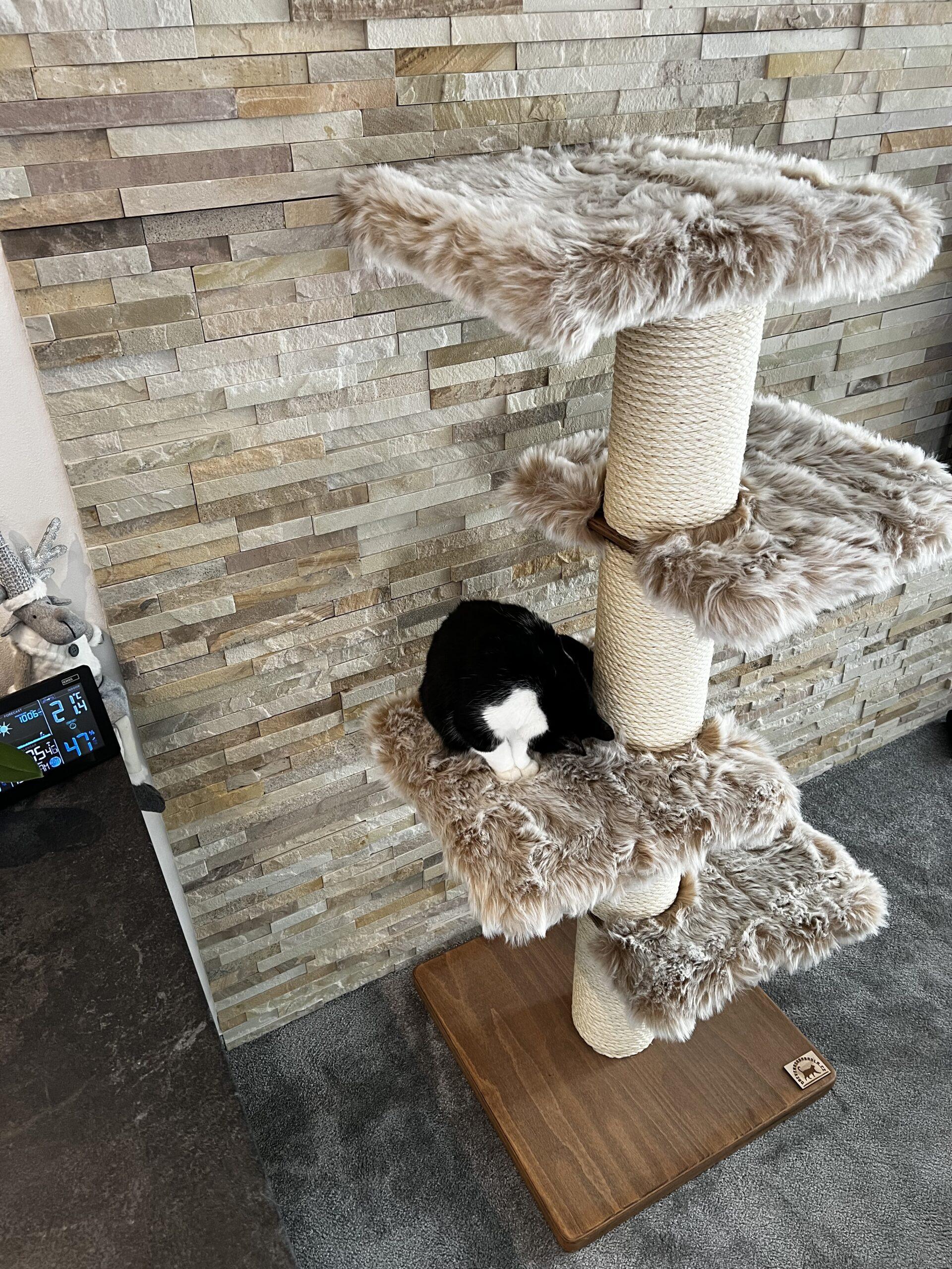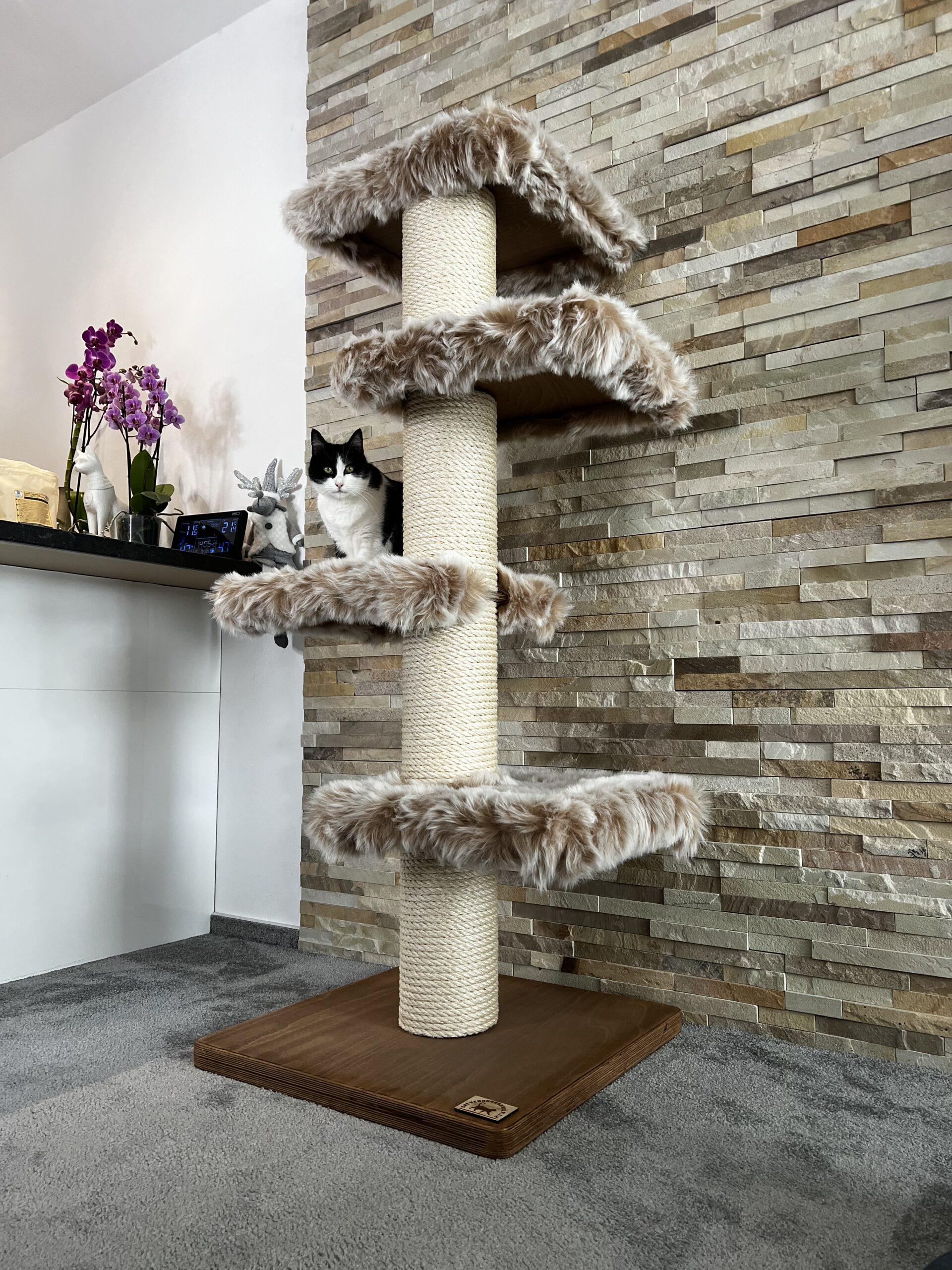 Cat tree / Cat scratcher in combination with luxurious removable fur and strong sisal rope. Strong paper cylinders in combination with wooden boards create very sturdy scratching posts that do not need to be anchored to the wall at all and are free-standing.