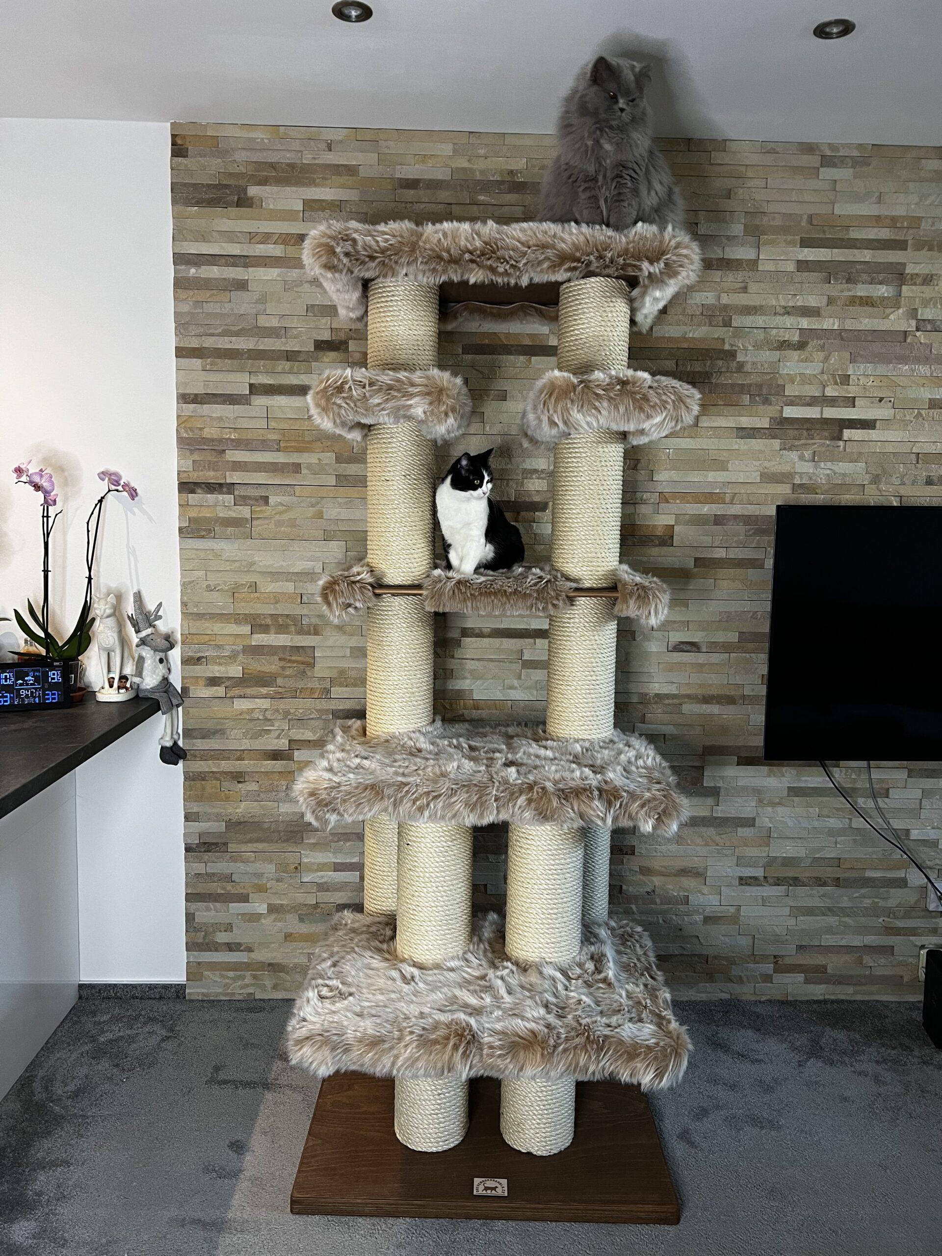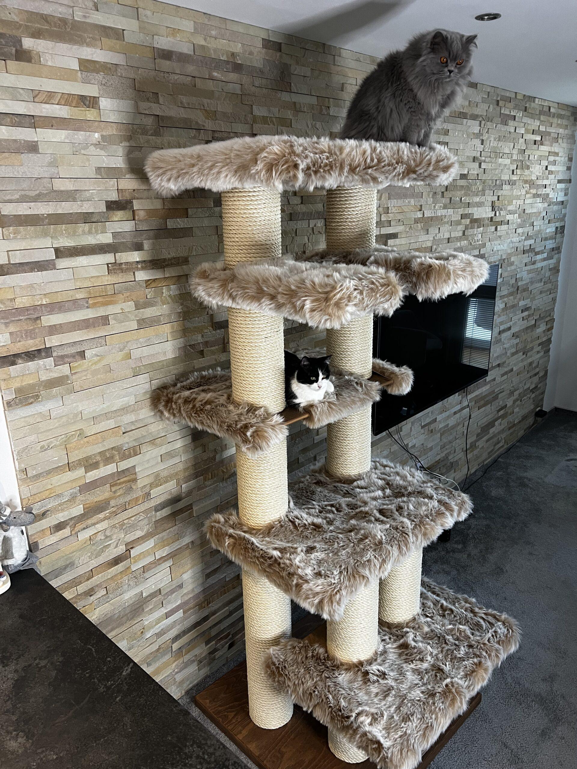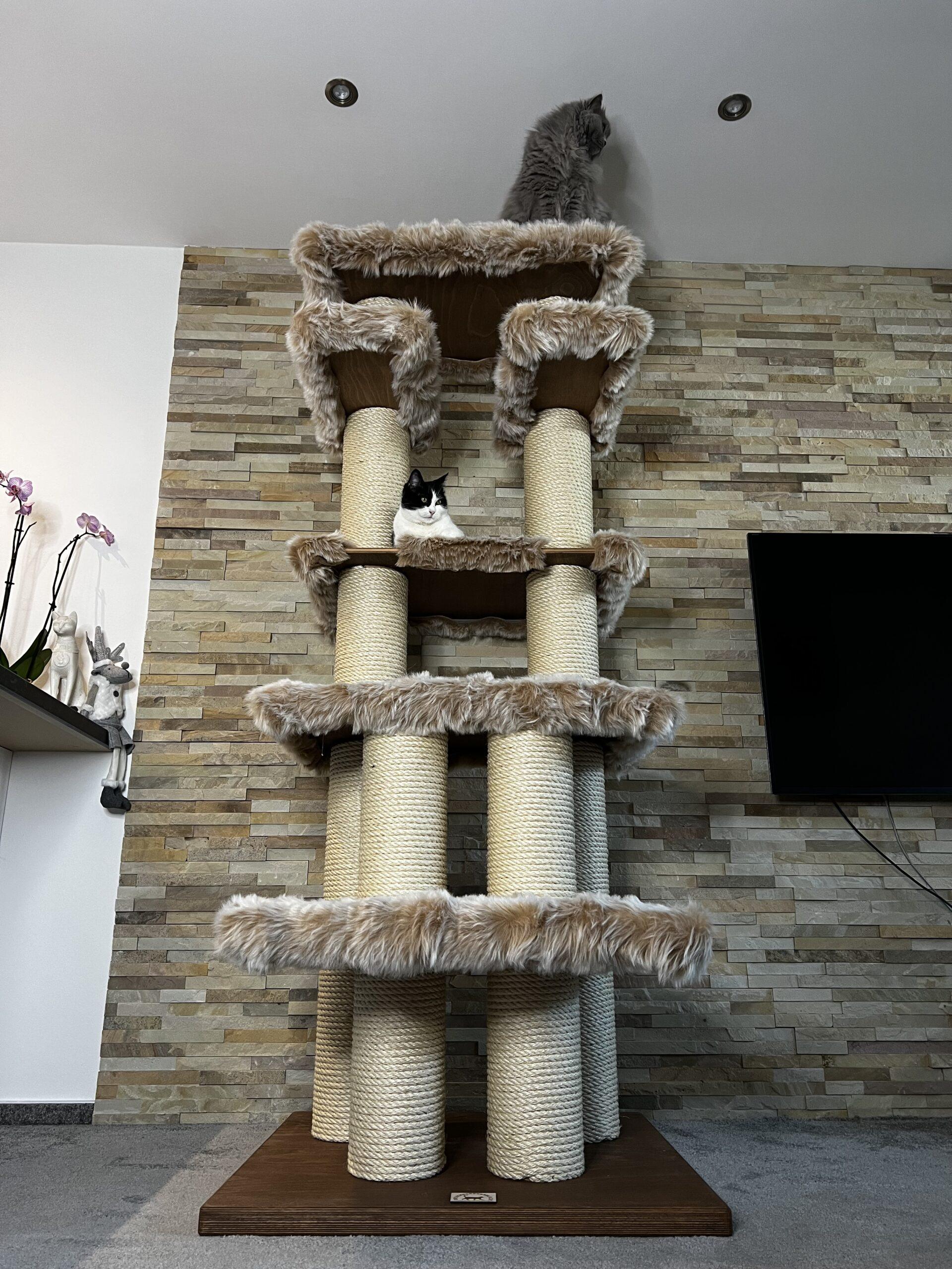 High cat tree / Hight cat scratcher in combination with luxurious removable fur and strong sisal rope. Strong paper cylinders in combination with wooden boards create very sturdy scratching posts that do not need to be anchored to the wall at all and are free-standing.