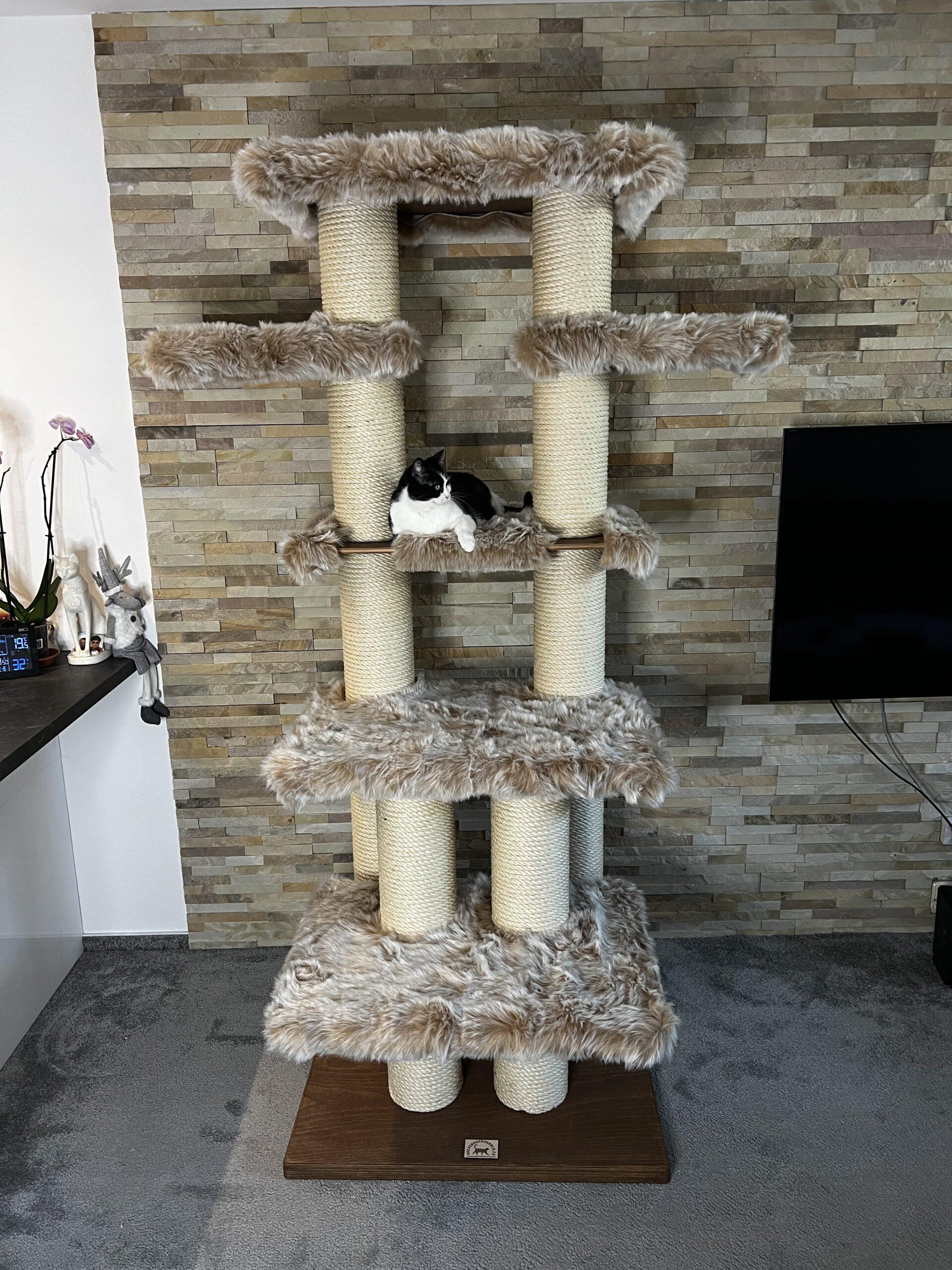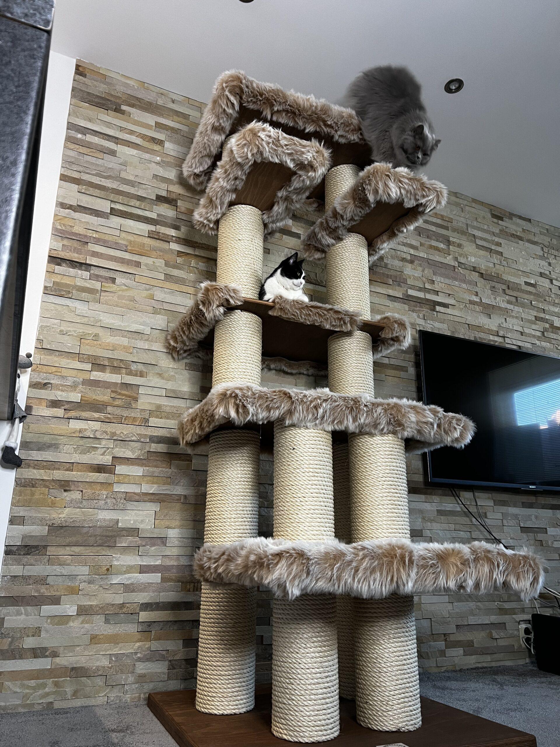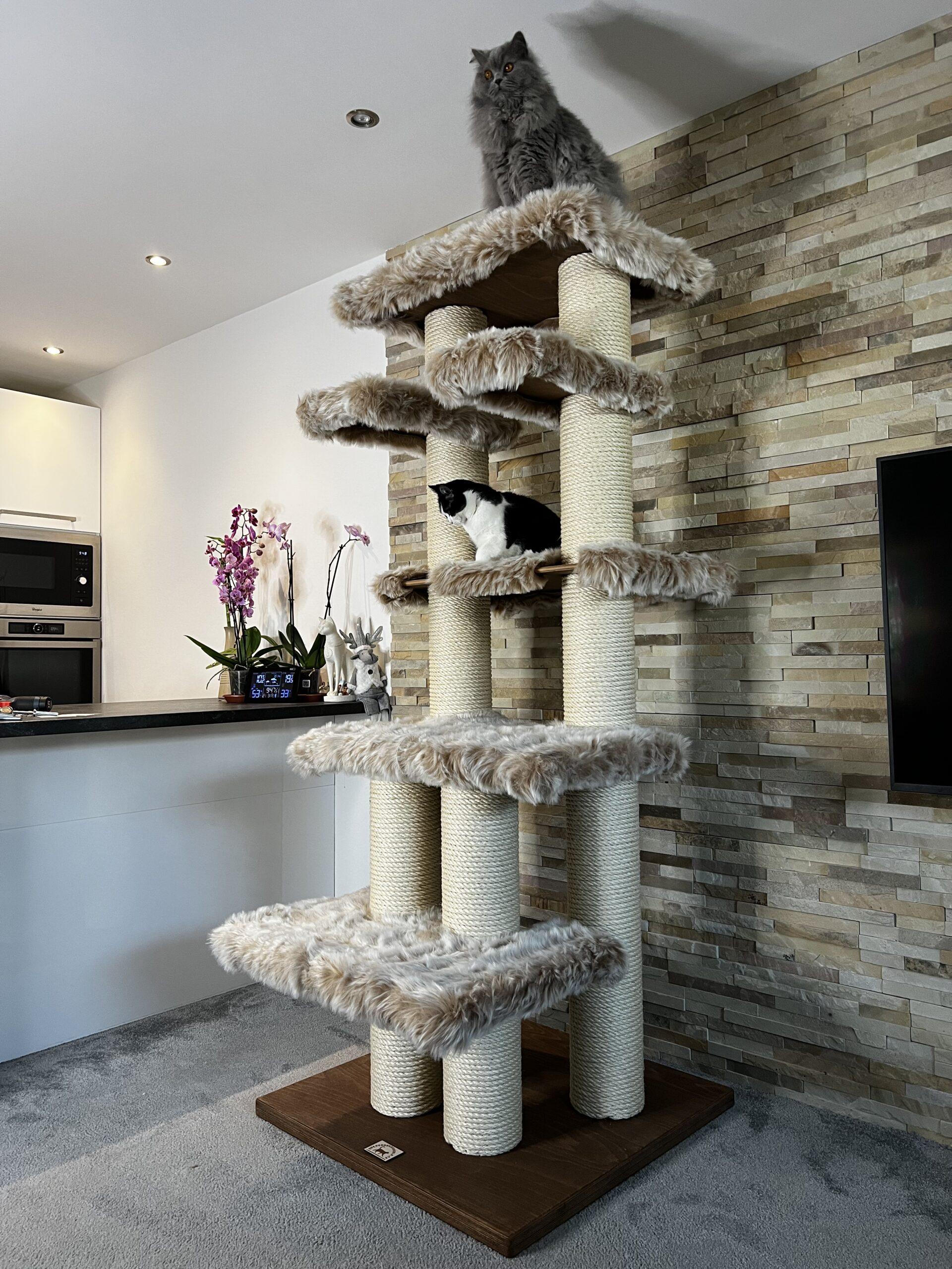High cat tree / Hight cat scratcher in combination with luxurious removable fur and strong sisal rope. Strong paper cylinders in combination with wooden boards create very sturdy scratching posts that do not need to be anchored to the wall at all and are free-standing.